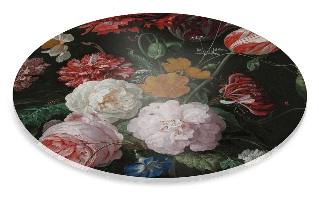 Set van 6 stijlvolle en kleurrijke onderzetters voor glazen. De onderzetters zijn allemaal voorzien van een afbeeldingen van het bekende schilderij Bloemen in een glazen vaas van Jan Davidsz de Heem.
